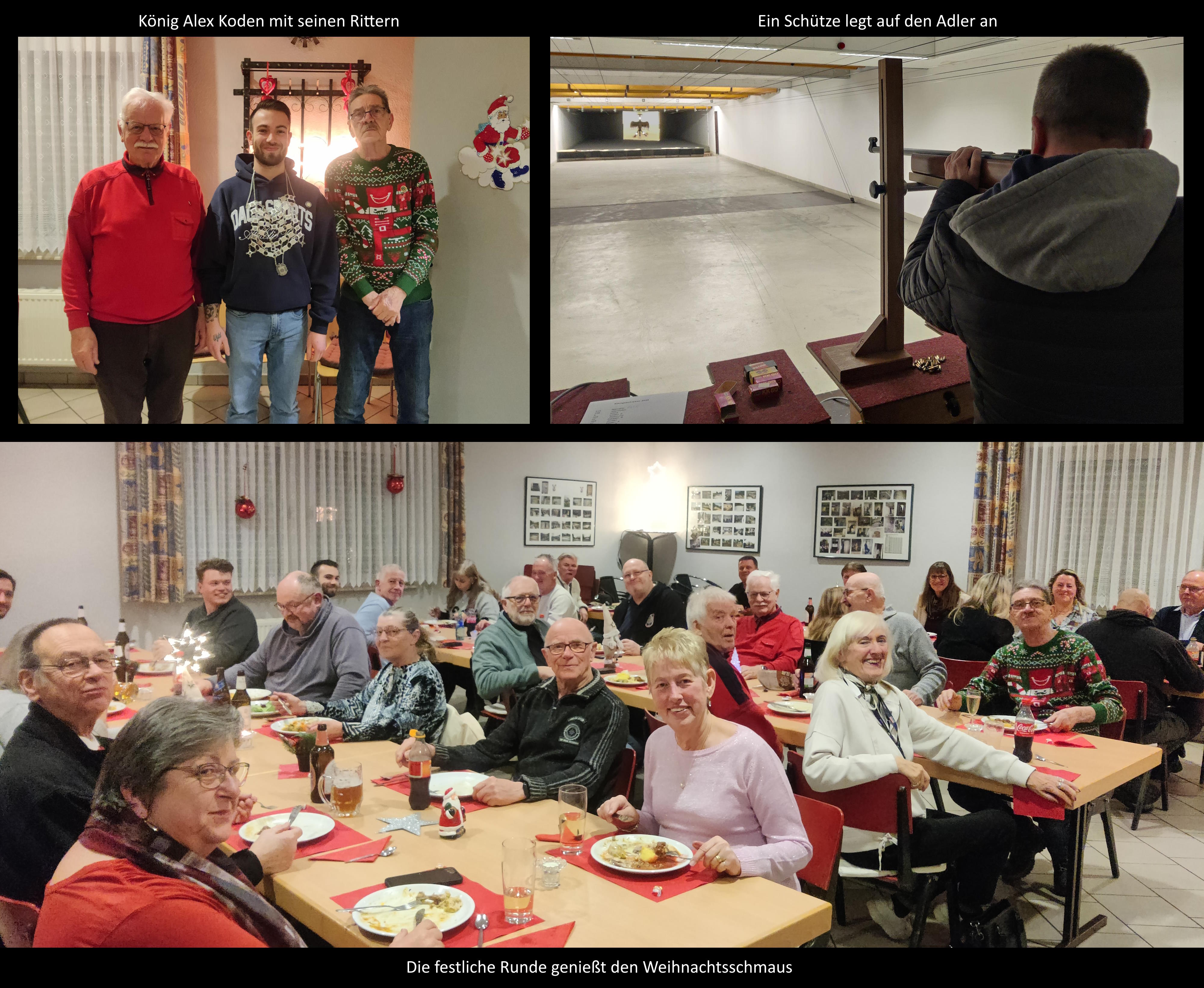 Wie in jedem Jahr wurde auch heuer auf der Weihnachtsfeier des Vereins der neue Schützenkönig ausgeschossen. Der Ablauf blieb weiterhin unverändert: In 25 Metern Abstand wurde ein hölzerner Adler aufgestellt, der in seinen Fängen Reichsapfel und Zepter hält und auf seinem Haupt eine Krone trägt. Die Schützen geben nacheinander je einen Schuss ab und versuchen ihm dabei nacheinander die beiden Insignien aus den Fängen und die Krone vom Haupt zu holen. Dass diese aus einem Stück mit dem Rest des Adlers geschnitzt sind, macht die Aufgabe allerdings alles andere als einfach. Obgleich sich die Schützen dieses Mal zielsicherer zeigten als noch im letzten Jahr, zog sich das Prozedere doch etwa eineinhalb Stunden. Fast 100 Schuss vergingen, bis Wolfgang Jordan den Reichsapfel zu Fall bringen konnte, was ihm den Titel des zweiten Ritters einbrachte. Danach hatte sich die Versammlung allerdings gut eingeschossen: Nur 50 Schuss später sank das Zepter nach einem Treffer des nun ersten Ritters Hans Klima zu Boden. 60 weitere Schuss und Alex Koden brach dem Adler das Genick, das Haupt samt Krone ächzte und ergab schließlich krachend der Schwerkraft. Donnernder Applaus erfüllte den Schießstand, man verneigte sich anerkennend vor demjenigen, dem nun bald die Krönung bevorstand. Bevor der zeremonilelle Teil des Abends beginnen konnte, brachte das Küchenteam die fast genau so frohe Kunde, dass das Essen angerichtet sei. Seine zukünftige Majestät erhob keine Einwände gegen den Verzehr des Festmahles, welches der erste Vorsitzende Franz Kautzmann feierlich eröffnete. Liebe geht schließlich durch den Magen und die neue Hoheit erkannte, dass es wenig weise gewesen wäre, sich die Gunst der Untertanen dadurch zu verspielen, sie von einem so vorzüglichen Schmause abzuhalten: Minipizzen als Vorspeise, Hühnchen in Sahnesoße, Gulasch mit Spätzle, Knödeln und verschiedenen Gemüsen als Hauptspeise sowie Mousse au Chocolat und Vanille-Apfel-Joghurt als Dessert. Man könnte fast meinen, dass der Verein kulinarisch sogar noch besser als sportlich aufgestellt wäre! Mit runden Bäuchen und zufriedenen Lächeln im Gesicht gab die Runde ihre Zustimmung, die Krönung einzuleiten. Unter dem wachsamen Auge des Vorsitzenden Kautzmann krönte der scheidende König Bernd Zell seinen Nachfolger mit der Amtskette, die Untertanen spendeten Beifall. Seine Majestät spürte sogleich die Bürde seiner Position, als das Zeremonialprotokoll seine erste Amtshandlung bestimmte: Mit Tatkräftiger Unterstützung seiner Ritter oblag ihm der Ausschank des Absackers zur Abrundung des Weihnachtsschmauses.